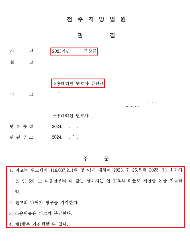 김민규 변호사의 이러한 적극적인 조력으로 인해 법원은 이 사건 주된 채무 및 이에 대한 피고(A)의 연대보증약정이 불확정기한부 법률행위라고 판단되고 이에 정지조건이 붙은 것이라 보기 어렵다는 점 등을 받아들여 의뢰인(원고)의 청구를 전부 인용하는 판결을 선고하였습니다.